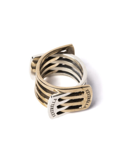 L’essenza di questo gioiello risiede nel paradosso della sua forma: aperto a riposo, ma indissolubile una volta calzato. L’inserimento del dito funge da perno strutturale, rendendo l’intreccio dei due metalli un’unità inscindibile. La finitura del bronzo, dai toni caldi e terrei, si contrappone alla lucentezza austera dell’argento, creando un gioco cromatico che evolve con il tempo.