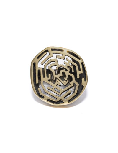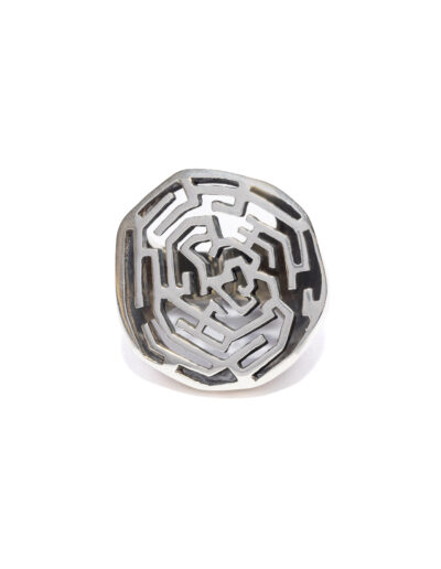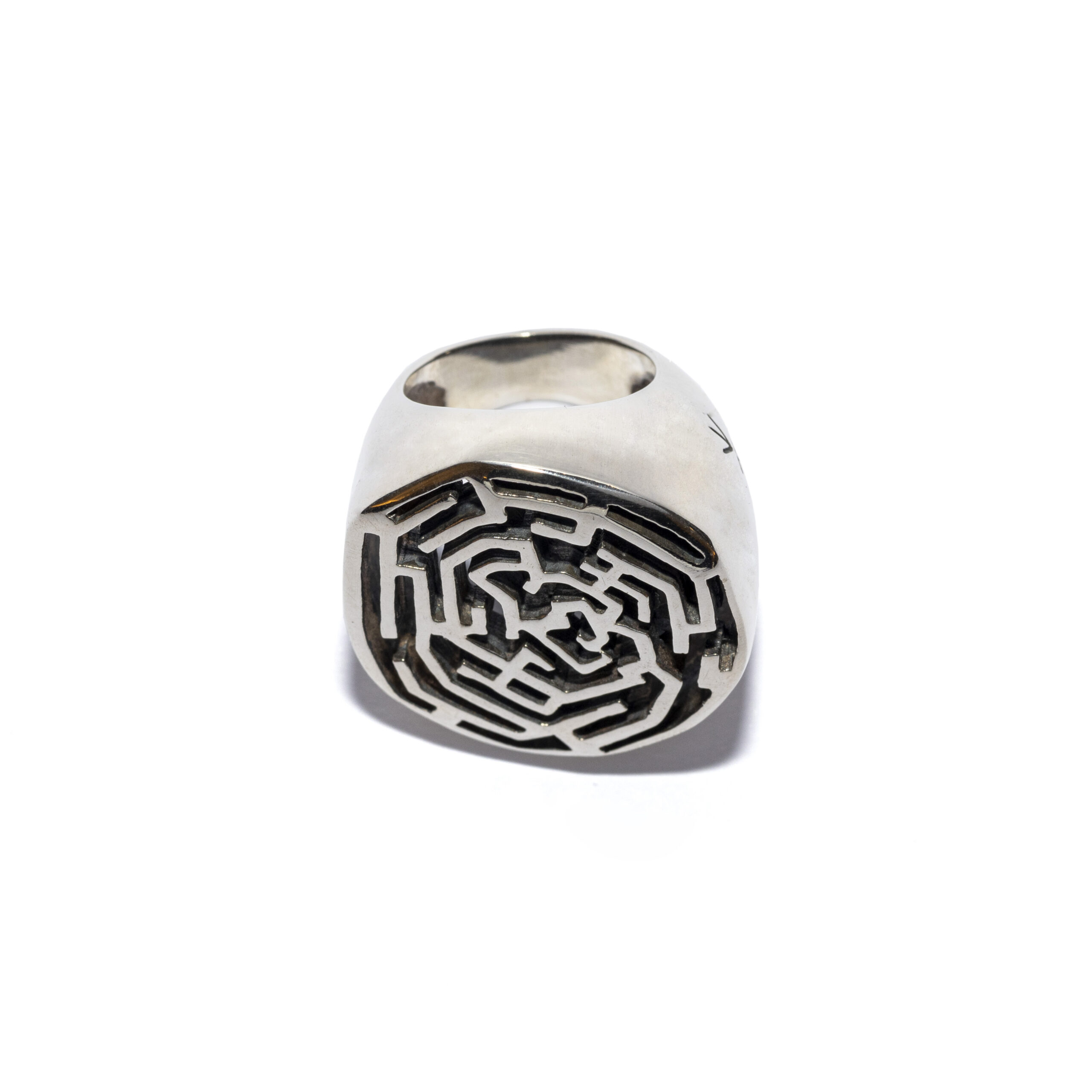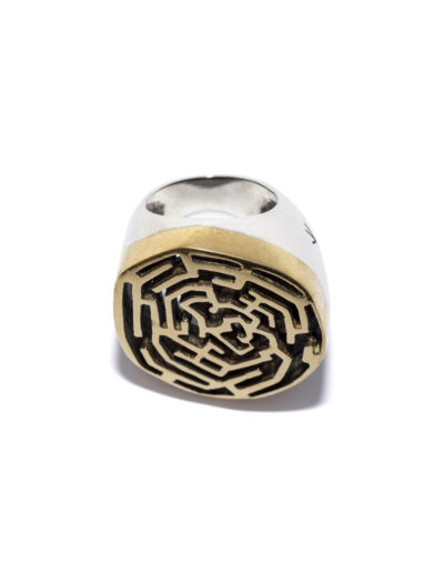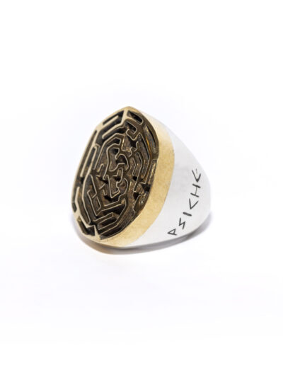La struttura è un solido in Argento 925 che integra un inserto superiore in Bronzo. Questa combinazione cromatica non cerca l’armonia, ma una tensione visiva che rompe lo schema classico.