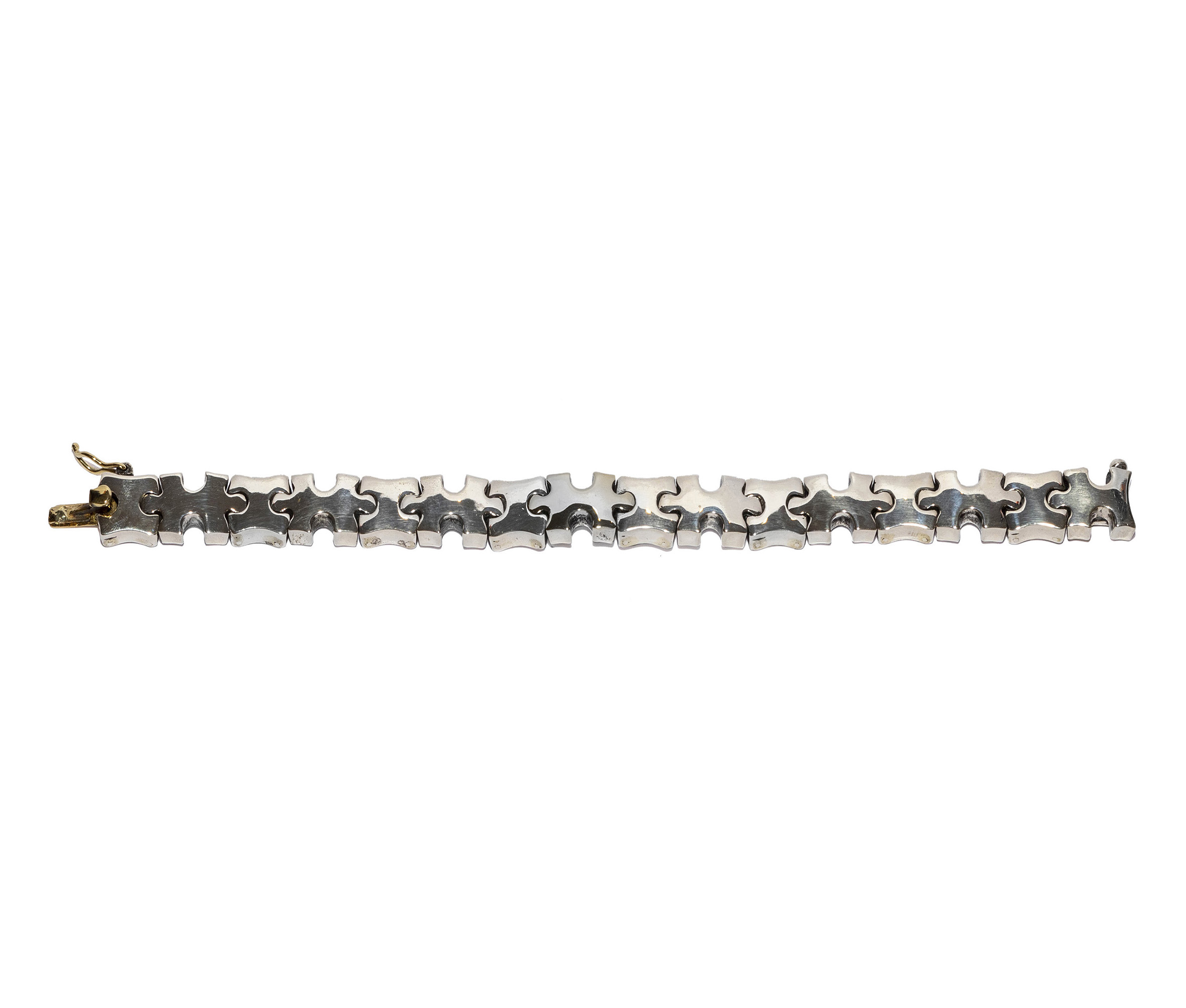 Realizzato con cura artigianale in argento o oro (su richiesta), il bracciale è composto da una sequenza di elementi modulari, ognuno dei quali richiama la sagoma delle tessere di un puzzle. Le linee morbide e l’alternanza di pieni e vuoti donano movimento e leggerezza al gioiello, mentre la chiusura è integrata con eleganza nel disegno, garantendo comfort e sicurezza.